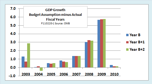 That tendency toward chronic budget optimism is well documented in the OMB's own data base, which lets us compare the assumptions on which past budgets were based with the actual performance of the economy. Here is what we find if we compare actual data for 2003 through 2010 with budget assumptions: